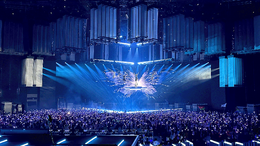 Зона ответственности компании BSS на конкурсе «Интервидение’25» включала в себя гигантский 52-метровый гибкий экран-задник, светодиодный пол сцены, оборудованные экранами выдвижные платформы для получения эффекта «полета» и «парения» артистов, множество подвесных конструкций с вмонтированными в них экранами, 10 серверов Disguise D3 с полным резервированием, разрешением до 8K и синхронизацией с аудио и сценической механикой, а также километры силовых кабелей и оптоволоконных линий.