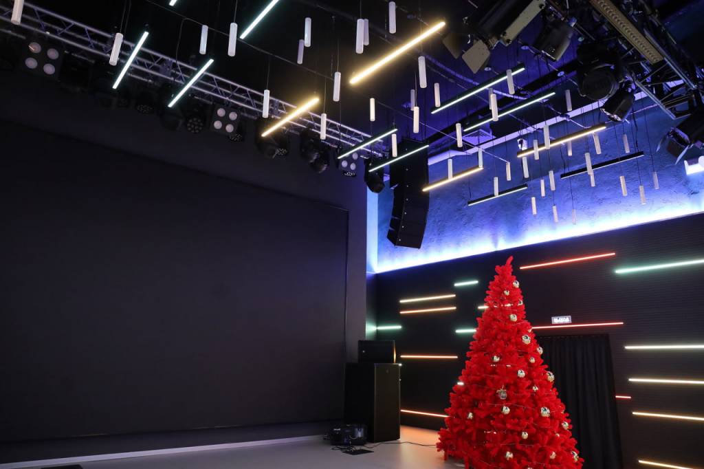 Оснащен 8×3,52 метровым светодиодным экраном. Предусмотрены IP-камеры Lumens VC-A51PW с FullHD разрешением, 20-кратным оптическим зумом, система записи и трансляции.