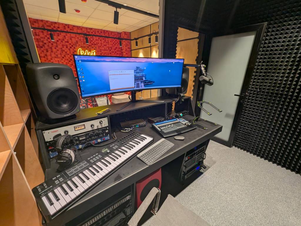Студия звукозаписи оснащена виниловым проигрывателем PIONEER PLX-1000-K, проигрывателем PIONEER XDJ-1000 MK2, DJ проигрывателем PIONEER DJM-750MK2, DJ-микшером и электронной ударной установкой ROLAND TD-17KVX2.