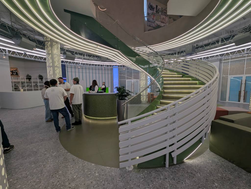 Пространство оборудовано LED-экранами, создавая динамичную визуальную среду, которая может оперативно трансформироваться под формат различных мероприятий. Кроме того, экраны позволяют обыграть архитектурное строение помещений таким образом, чтобы эффектно подчеркнуть его особенности, контент на всех экранах холла выводится синхронизировано.