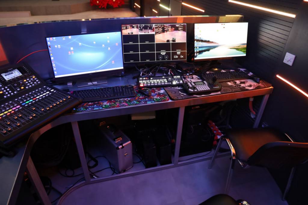 Оснащен 8×3,52 метровым светодиодным экраном. Предусмотрены IP-камеры Lumens VC-A51PW с FullHD разрешением, 20-кратным оптическим зумом, система записи и трансляции.
